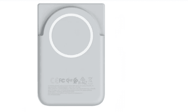 Gambar yang ditampilkan menunjukkan desain abu-abu terang yang minimalis dengan susunan cincin magnet melingkar seperti perangkat Qi2 lainnya.