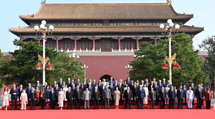 Usai sesi foto, rombongan pemimpin negara melangkah ke Tian’anmen Rostrum, tempat utama berlangsungnya perayaan.
