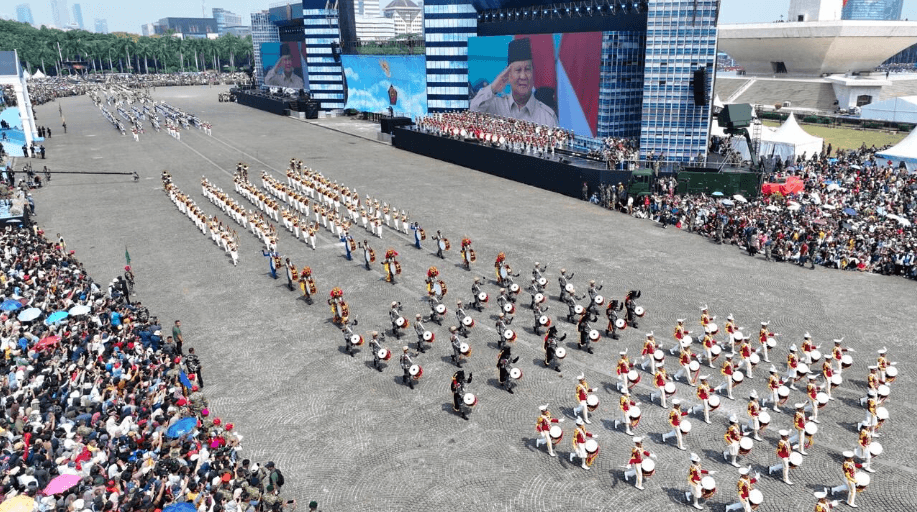 Presiden Prabowo, dari mimbar kehormatan, tampak fokus menyimak setiap manuver prajurit yang penuh disiplin dan presisi.