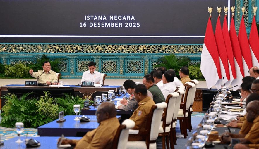 Presiden Prabowo Subianto memberikan pengarahan kepada Kepala Daerah se-Papua serta Komite Eksekutif Percepatan Pembangunan Otonomi Khusus Papua di Istana Negara, Jakarta, pada Selasa, 16 Desember 2025.(Presidenri)