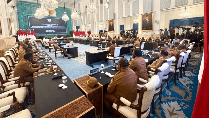 Presiden Prabowo Subianto menerima laporan langkah-langkah strategis percepatan pembangunan Otonomi Khusus Papua dalam pengarahan kepada Kepala Daerah se-Papua dan Komite Eksekutif Percepatan Pembangunan Otonomi Khusus Papua di Istana Negara, Jakarta, pada Selasa, 16 Desember 2025.