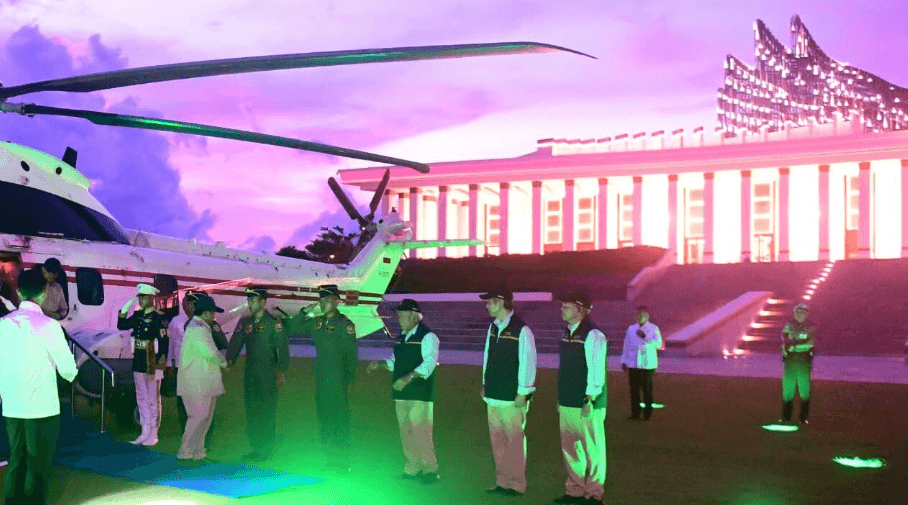 Pesawat kepresidenan mendarat di Helipad Halaman Istana Negara, Kawasan IKN, sekitar pukul 18.45 WITA.