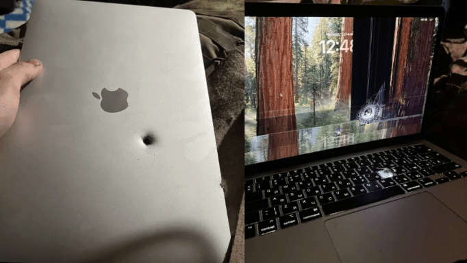 Seorang tentara Ukraina membagikan gambar sebuah Apple MacBook Air yang terkena pecahan proyektil artileri namun masih dapat menyala.